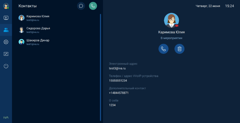 | Поиск контактов в видеотерминале IVA Room является динамическим, поэтому при вводе каждого последующего символа список контактов будет сортироваться по частичному совпадению |