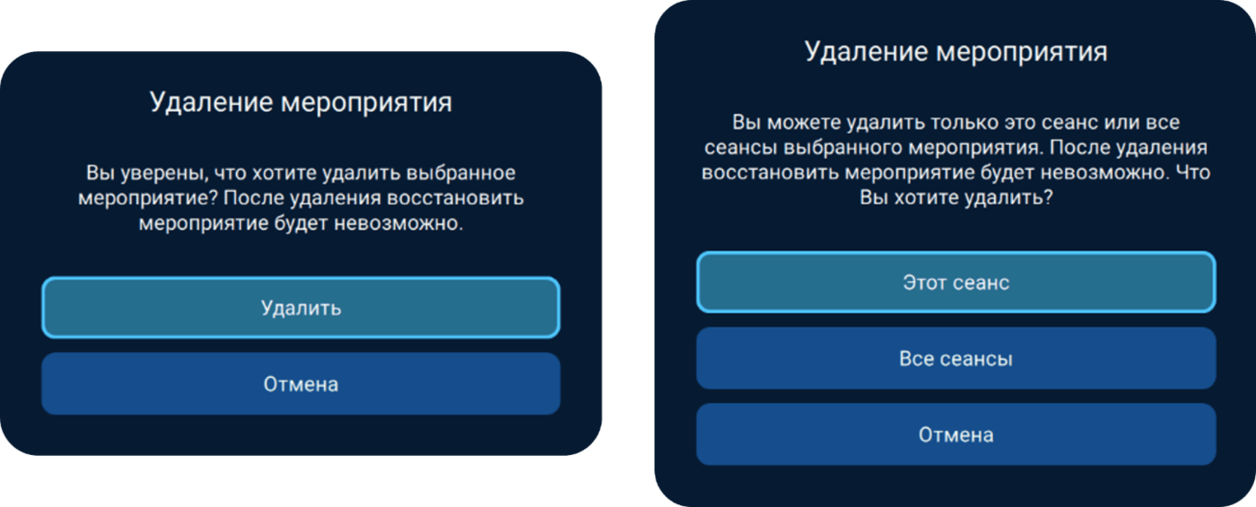 ГлавнаяВыбрать и нажать на карточку мероприятияИнформация о мероприятииНажать кнопку Удалить Иконка УдалитьУдаление мероприятияНажать кнопку Удалить или Выбрать Этот сеанс / Все сеансы (периодическое мероприятие)
