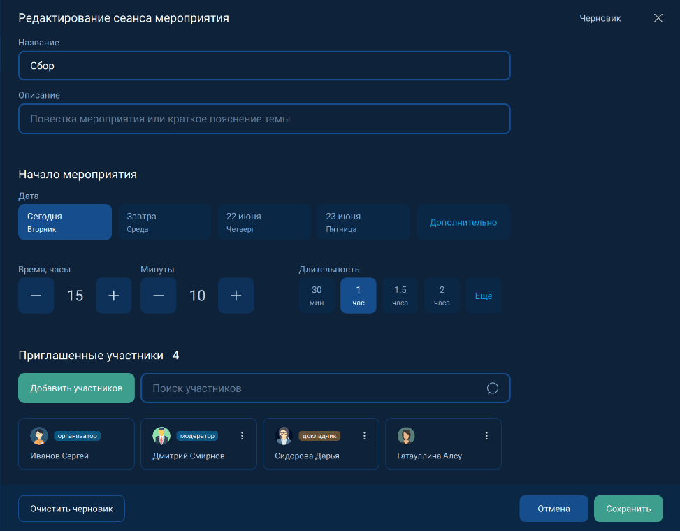 ГлавнаяНажать кнопку Запланировать Иконка ЗапланироватьПланирование мероприятияНазвание: Ввести названиеОписание: Ввести описание (при необходимости) → Шаблон: Выбрать шаблон мероприятияНачало мероприятия: Выбрать дату, время и длительностьПериодичность: Выбрать периодичность мероприятияПриглашенные участники: Добавить участниковНазначить роли участникам (при необходимости) → Нажать кнопку Запланировать