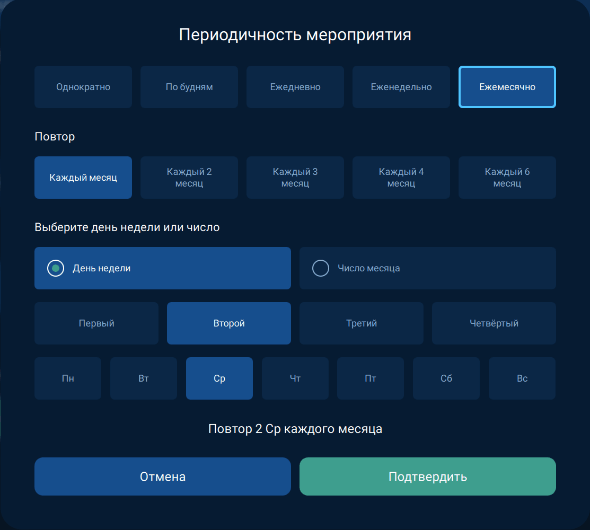 При создании мероприятия необходимо установить его периодичность: