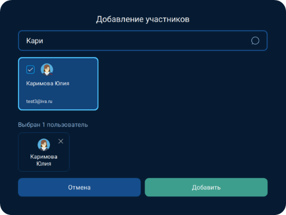 Планирование мероприятия → Нажать кнопку Добавить участников → Добавление участников → Строка поиска: Ввести email / номер телефона / адрес VVoIP-устройства пользователя → Нажать кнопку Добавить