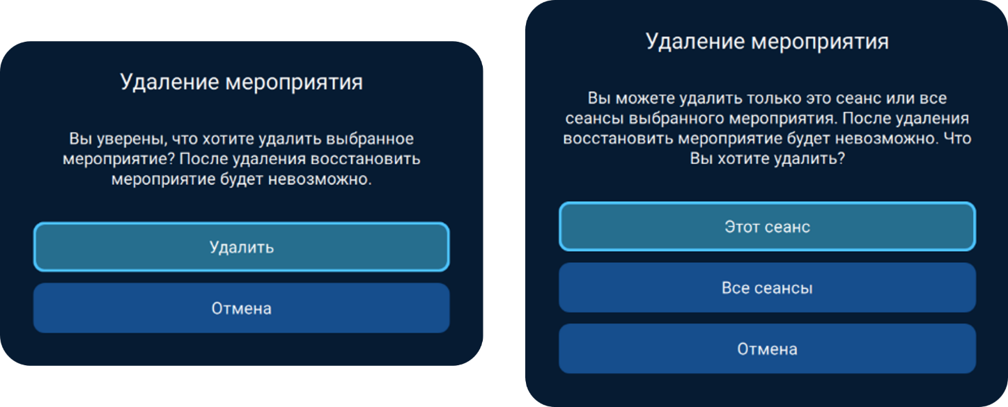 Главная → Выбрать и нажать на карточку мероприятия → Информация о мероприятии → Нажать кнопку Удалить → Удаление мероприятия → Нажать кнопку Удалить или Выбрать Этот сеанс / Все сеансы (периодическое мероприятие)