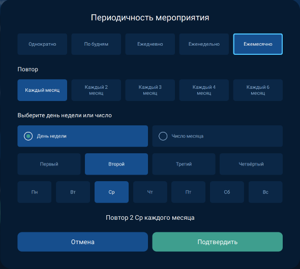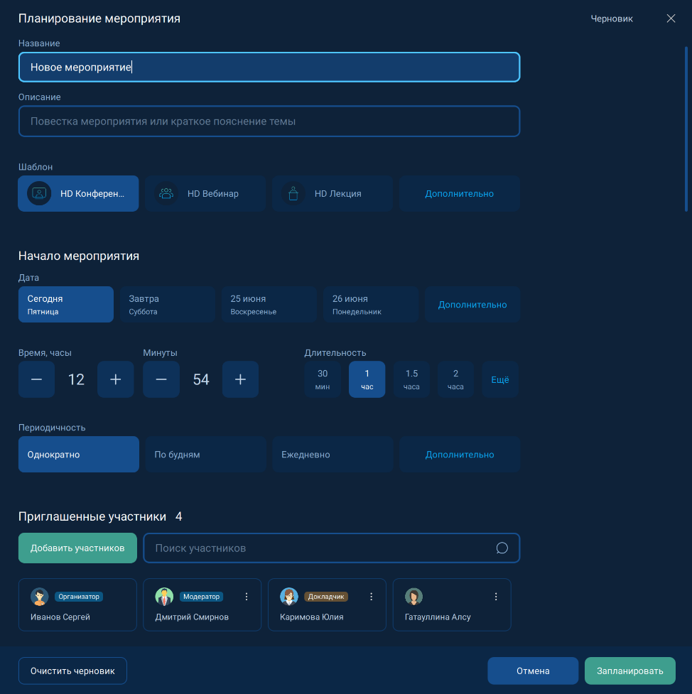 → Планирование мероприятия → Название: Ввести название → Описание: Ввести описание (при необходимости) → Шаблон: Выбрать шаблон мероприятия → Начало мероприятия: Выбрать дату, время и длительность → Периодичность: Выбрать периодичность мероприятия → Приглашенные участники: Добавить участников → Назначить роли участникам (при необходимости) → Нажать кнопку Запланировать