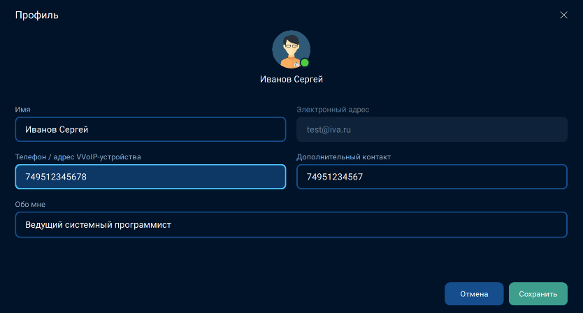 | При изменении персональных данных пользователя происходит автоматическое изменение этих данных и в других клиентских приложениях Платформы IVA MCU |