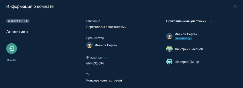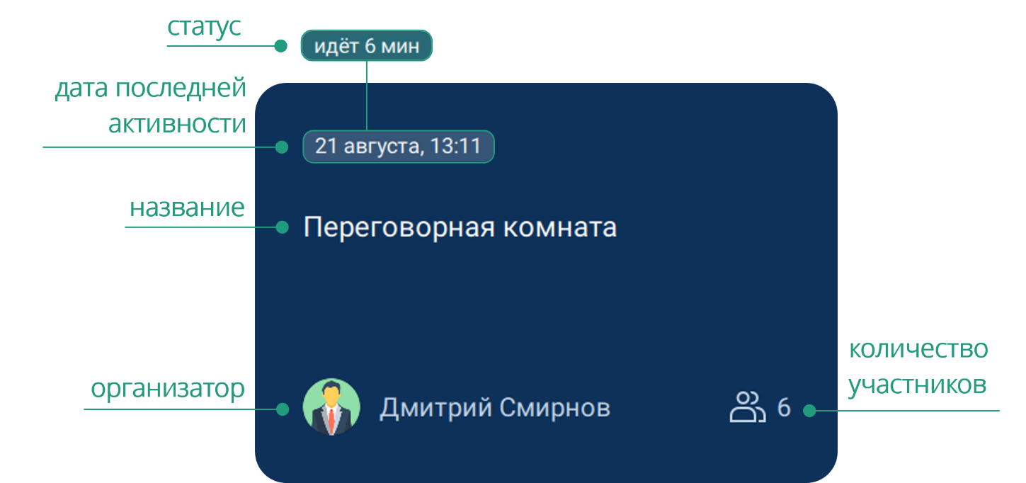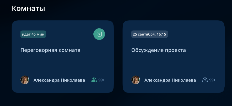 Комната — это постоянное мероприятие с заданными настройками, которое может длиться непрерывно, прекращаться и возобновляться в любой момент времени, как только Организатор, Модератор мероприятия или разрешённый к посещению пользователь в неё зайдёт. Комнаты доступны 24 часа в сутки. В комнате можно проводить конференции, вебинары, лекции, селекторы. Комнат может быть несколько, под каждую встречу / тему / отдел / проект или одна, в которой будут проводиться все встречи.