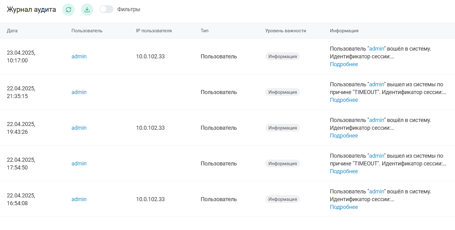 Чтобы посмотреть все хранящиеся в системе записи, необходимо перейти в раздел Журналы → Аудит