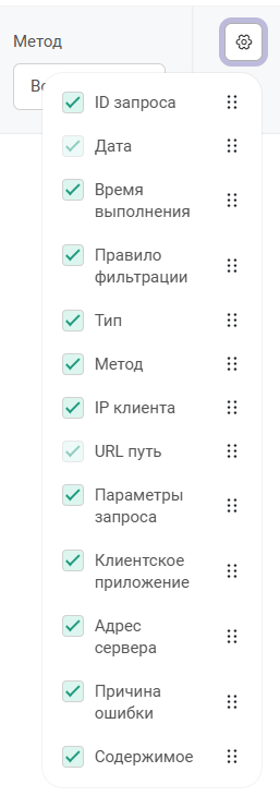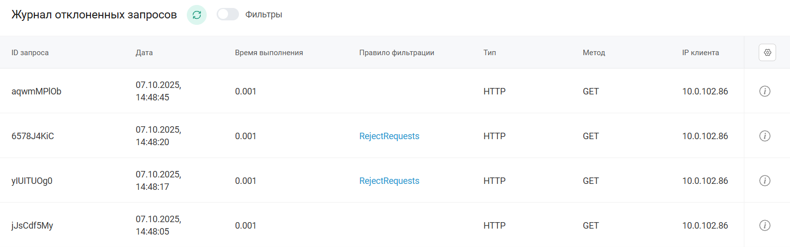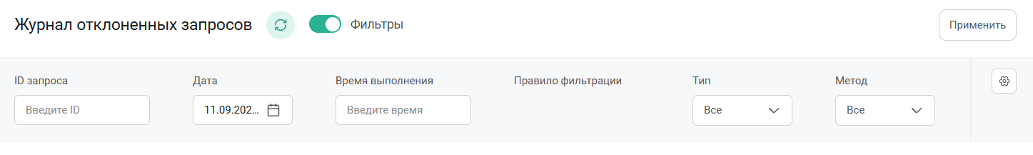 В разделе Журнал отклоненных запросов можно настроить фильтр отображения запросов. Чтобы включить фильтры, необходимо нажать переключатель Фильтры.