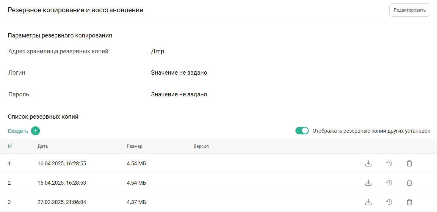 Чтобы посмотреть резервные копии других установок IVA SBC, необходимо нажать переключатель Отображать резервные копии других установок