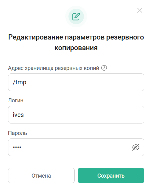 • Пароль: ввести пароль для доступа к серверу резервных копий (например ivcs)