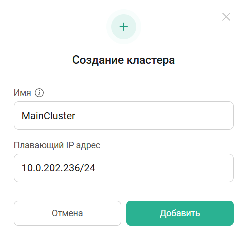• Имя: ввести имя кластера (рекомендуется вводить имя, которое кратко описывает назначение или плавающий IP-адрес, например MainCluster)