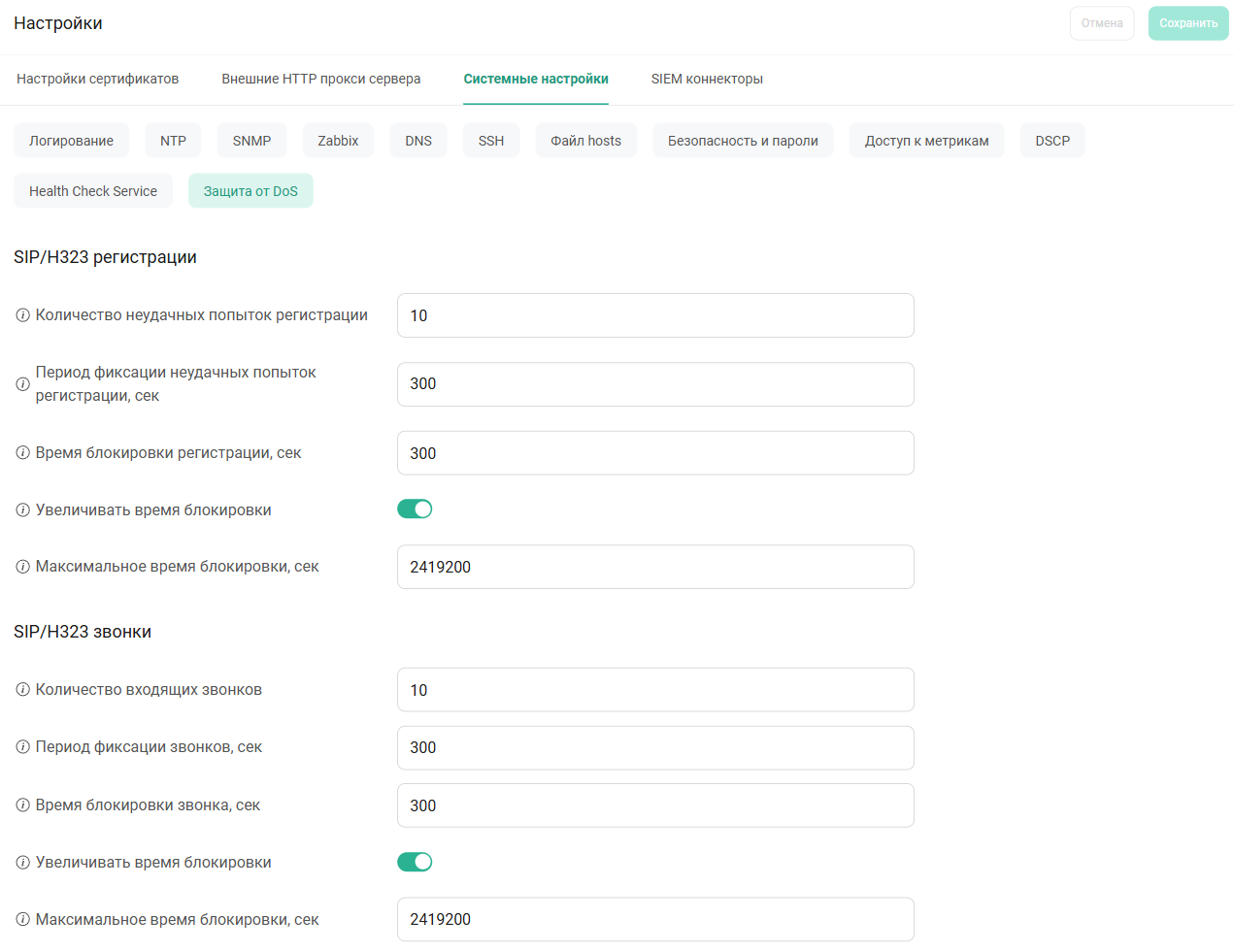 На вкладке Защита от DoS задаются ограничения на количество SIP- / H.323-регистраций и звонков с одного IP‑адреса и параметры их блокировки при превышении заданных значений.