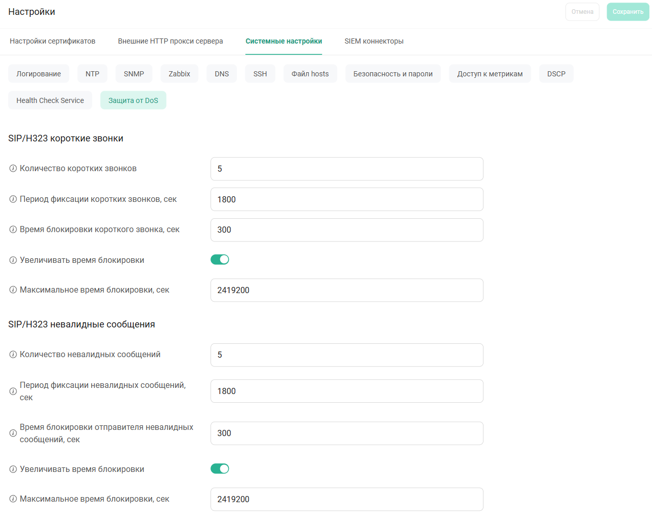 Количество невалидных сообщений — разрешённое количество невалидных SIP- / H.323-сообщений с одного IP-адреса