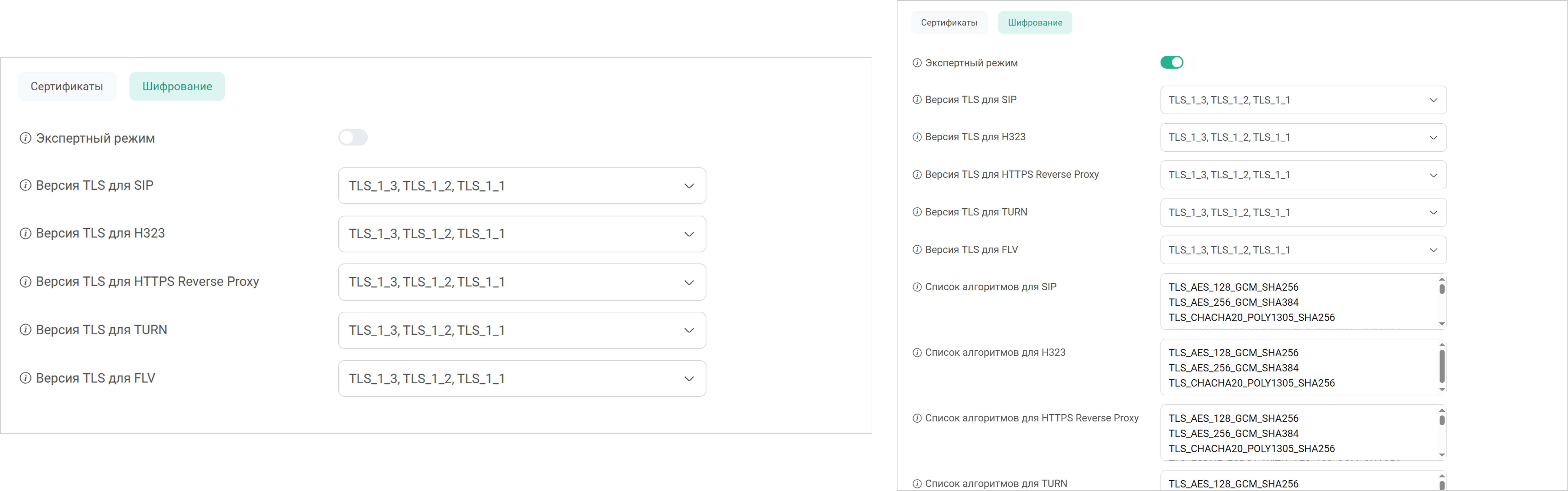 Вкладка Шифрование позволяет настроить TLS‑шифрование для установления безопасного соединения и защищённого обмена данными по протоколам SIP, H.323, TURN, HTTPS и FLV.