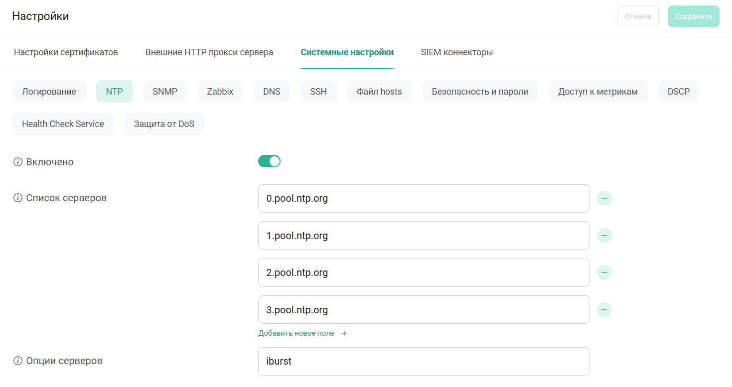 при необходимости добавить дополнительный NTP-сервер: нажать ссылку Добавить новое поле и ввести адрес NTP-сервера