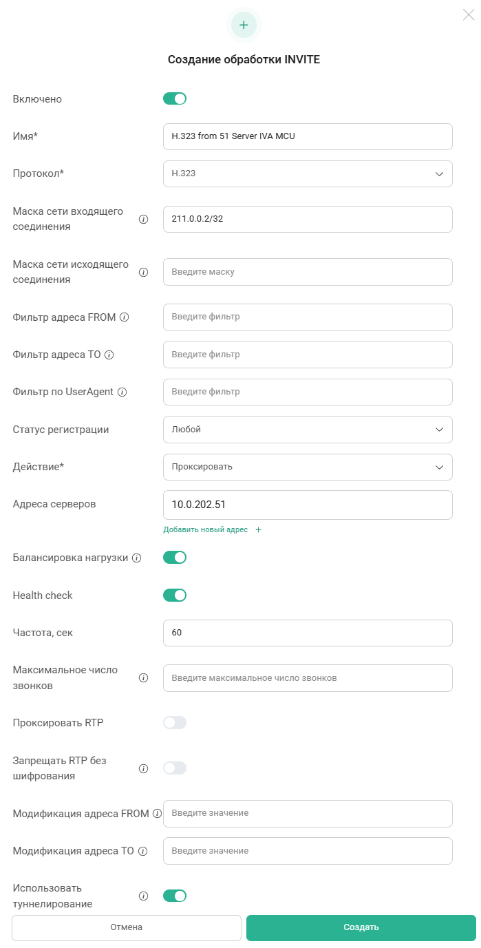 Создание правила обработки H.323-регистрации