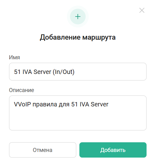 • Описание: рекомендуется вводить описание, отражающее результат работы маршрута (например: Разрешение входящих SIP- и H.323-вызовов для IVA MCU, и т. д.)