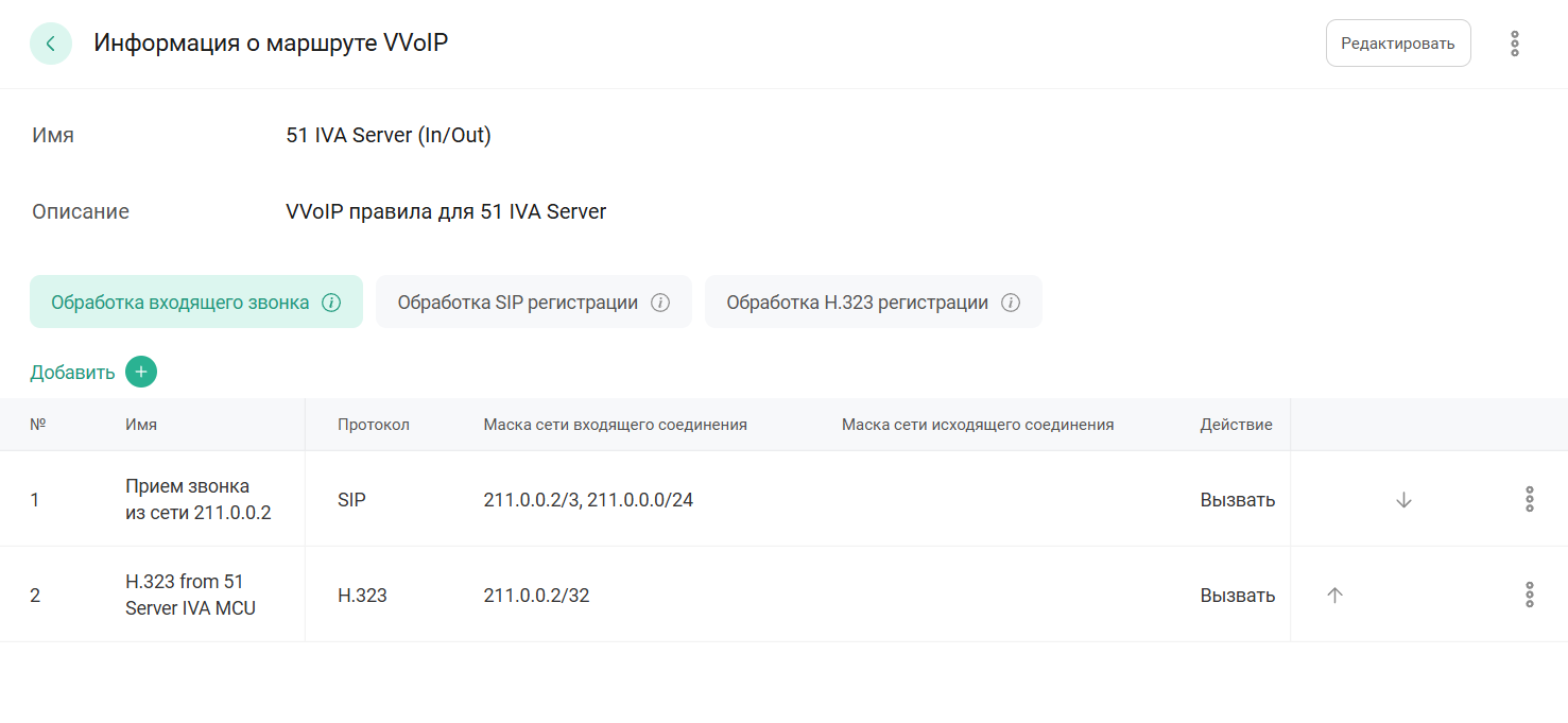 Список правил обработки маршрута VVoIP