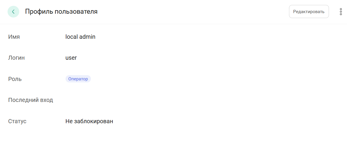 Администратор может также заблокировать пользователя с ролью Оператор через дополнительные действия в окне Профиль пользователя: нажать кнопку и выбрать Заблокировать.