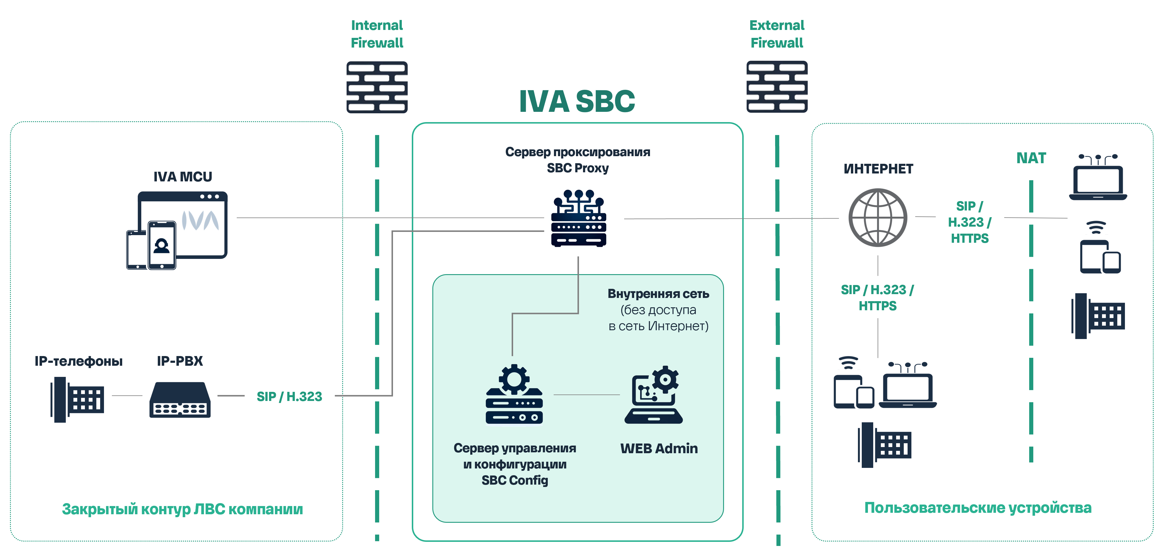 IVA SBC — это пограничный контроллер сессий, который устанавливается на границе двух сетей для обеспечения фильтрации трафика, не соответствующего установленным правилам, и безопасного соединения между пользователями в режиме реального времени. IVA SBC позволяет подключить корпоративную коммуникационную инфраструктуру к другим сетям (например Интернет и внутренняя сеть).
