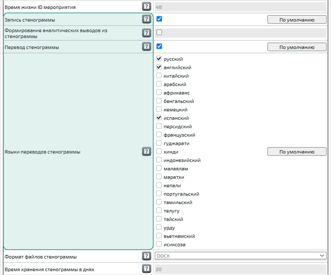 Языки переводов стенограммы — для выбора языков автоматического перевода стенограммы и аналитических выводов