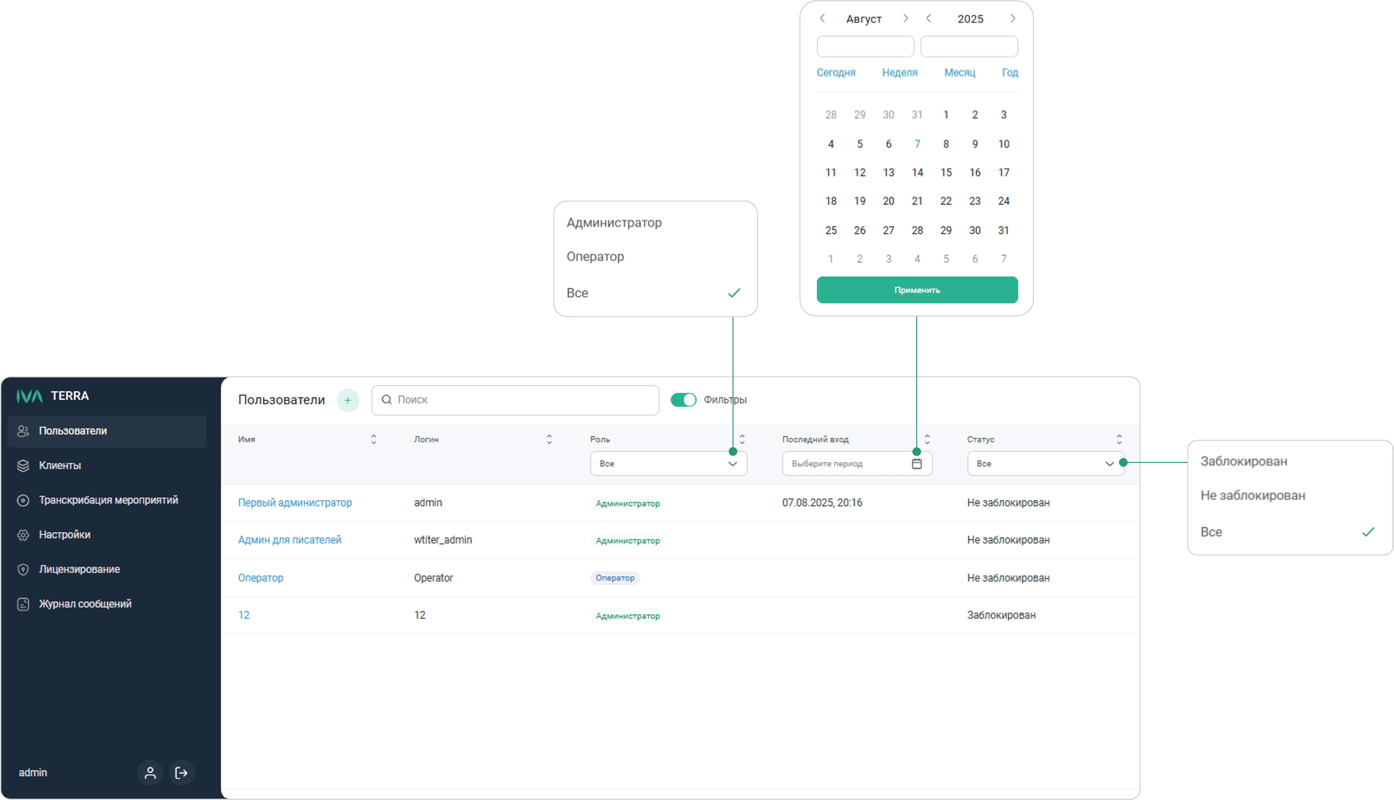 IVA Terra в разделе Пользователи предоставляет Администратору возможность управления учетными записями пользователей: