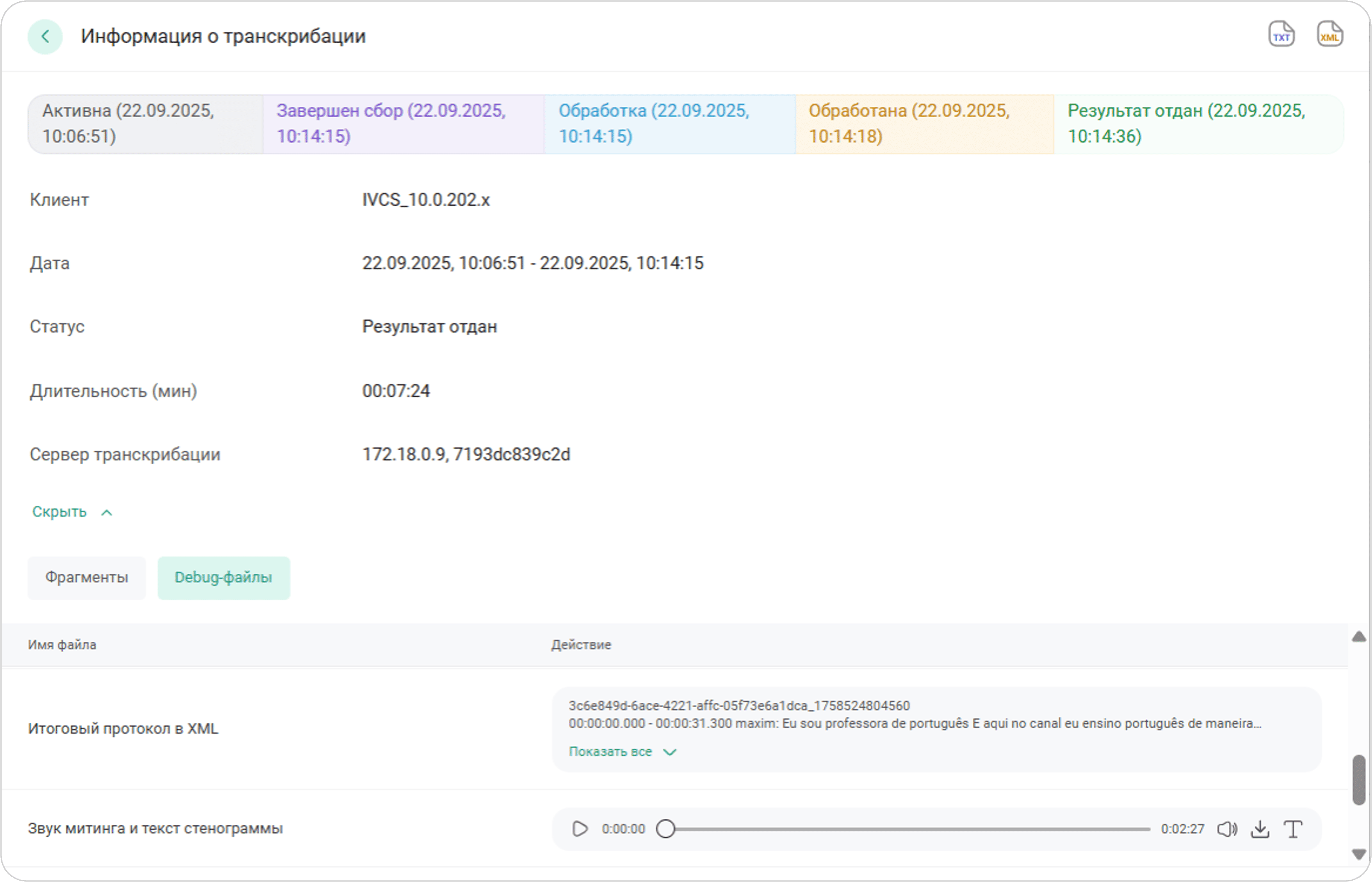 На вкладке Debug-файлы приведен список файлов, содержащих различную информацию о событиях транскрибации.