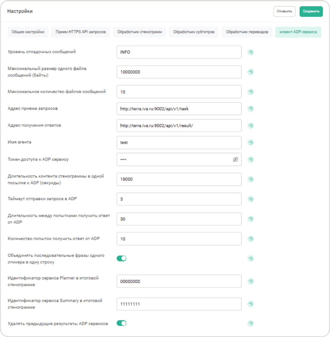 Раздел Клиент ADP-сервиса содержит параметры конфигурации для интеграции с модулем ADP, включая настройки подключения к ADP-сервису, аутентификации, управления запросами и обработки результатов для сервисов протоколирования (Planner) и суммаризации (Summary) стенограмм с целью автоматического извлечения поручений и генерации кратких сводок из стенограмм мероприятий.