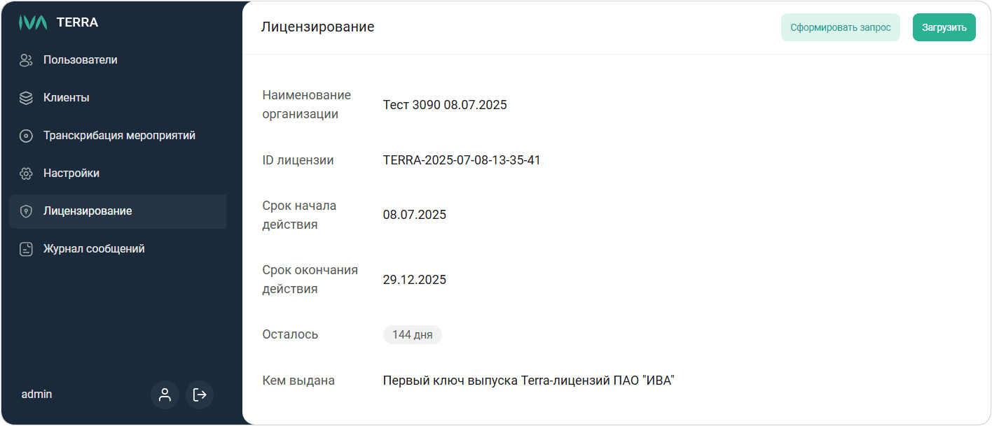 Раздел Лицензирование позволяет управлять лицензионным ключом системы, включая его запрос, загрузку и контроль срока действия.