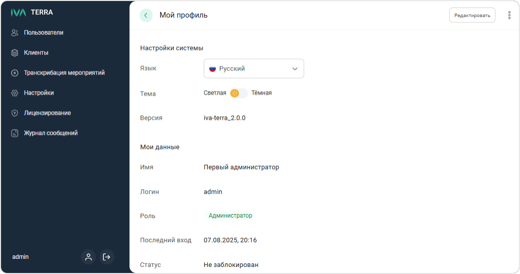 посмотреть данные собственного профиля пользователя (Имя, Логин, Роль, Последний вход, Статус)