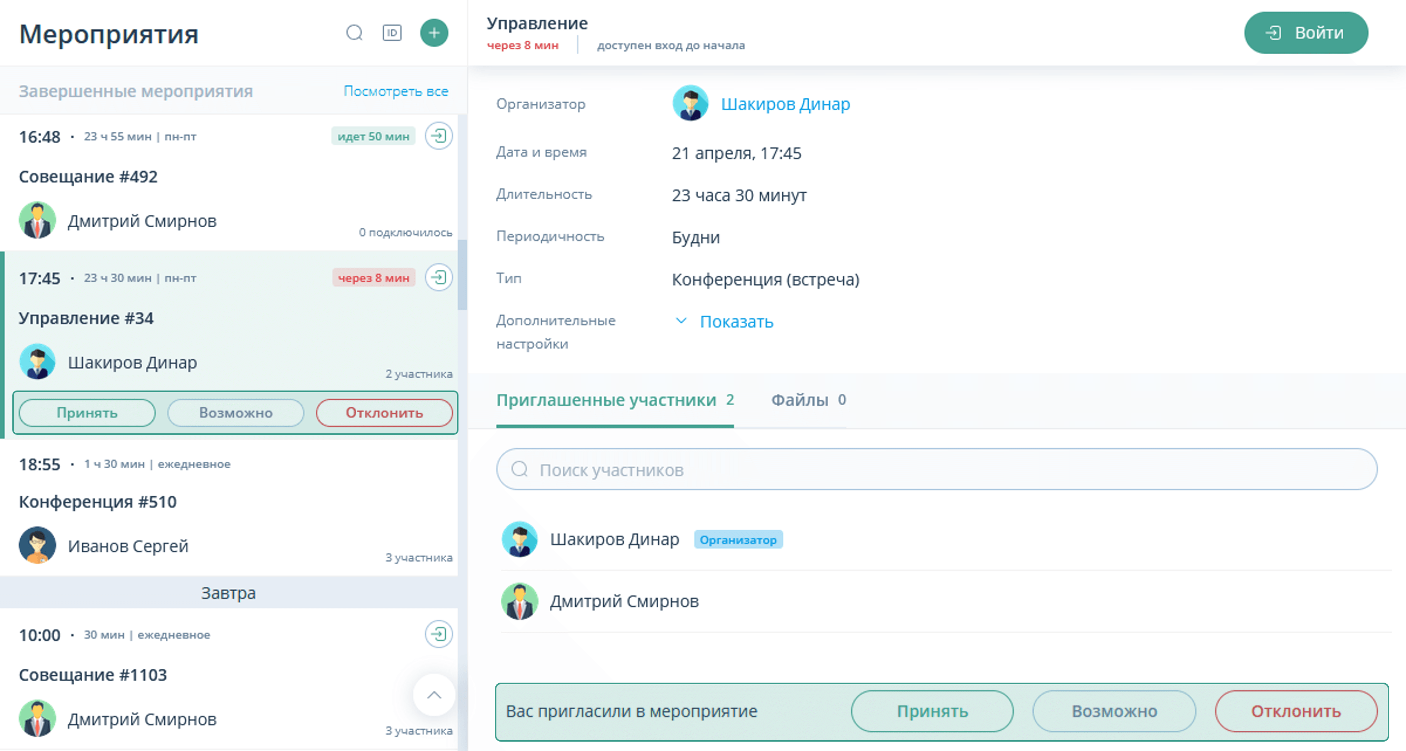 Если пользователя пригласили в запланированное мероприятие, то Платформа уведомит об этом в карточке мероприятия и области подробной информации, где необходимо принять решение: