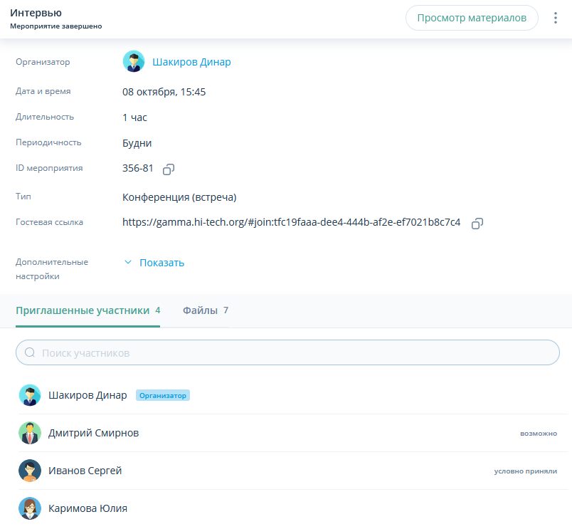 После окончания мероприятия его участникам доступна возможность просмотра контента прошедшего мероприятия. Возможность скачивания и просмотра материалов мероприятия зависит от настроек доступа и предоставленных прав Организатором / Модератором мероприятия.