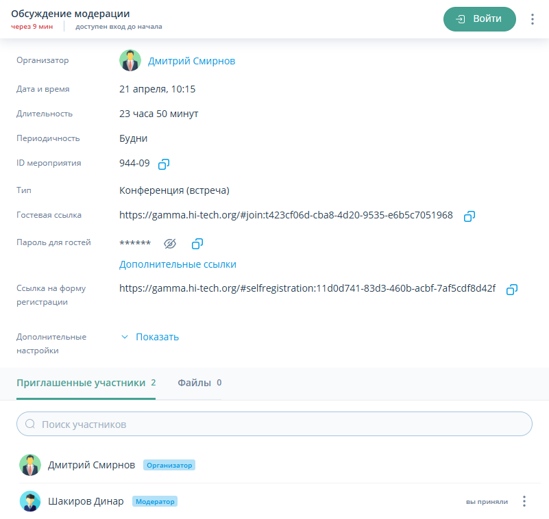 | ID мероприятия, Гостевая ссылка и Ссылка на форму регистрации видны только Организатору и Модератору мероприятия |
