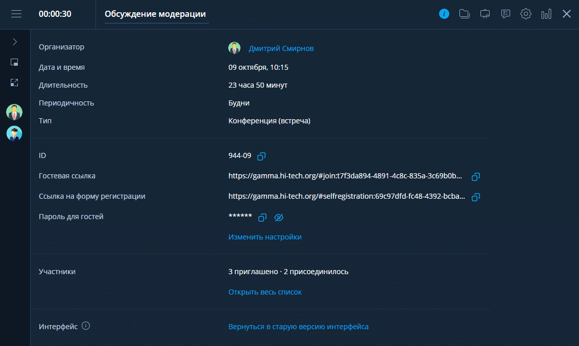 ID мероприятия, гостевая ссылка и ссылка на форму регистрации, пароль для гостей